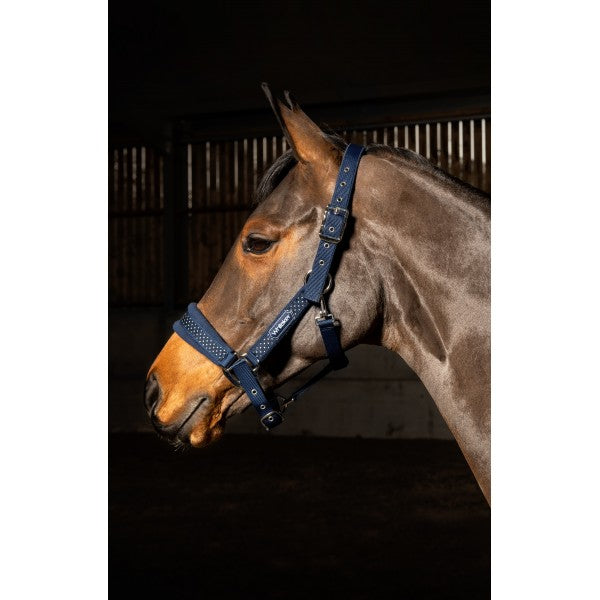 Don’t let the rich, dark navy colour of the San Francisco headcollar fool you, this head collar shines!  With a highly reflective dotted ribbon on the nose and cheek pieces this luxury headcollar will make sure you’re seen!